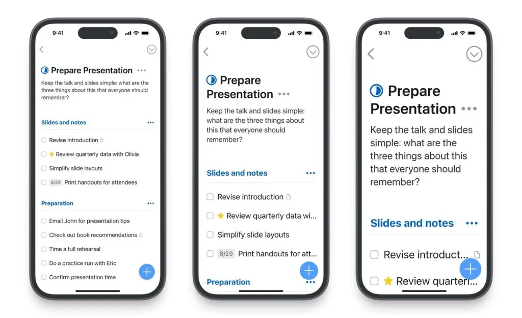 Thingsの新バージョンでは、アプリのアイコンを、画面サイズの変化に柔軟に対応するベクターグラフィックに置き換えることで、この課題を部分的に解決しています。特に文字サイズが大きい場合、テキストが途切れたり、アイコンのサイズが固定されたりすることがよくある問題です。Cultured Codeは、Thingsのレイアウトを微調整し、「すべてが美しく調和して拡大縮小されるように」したと述べています。